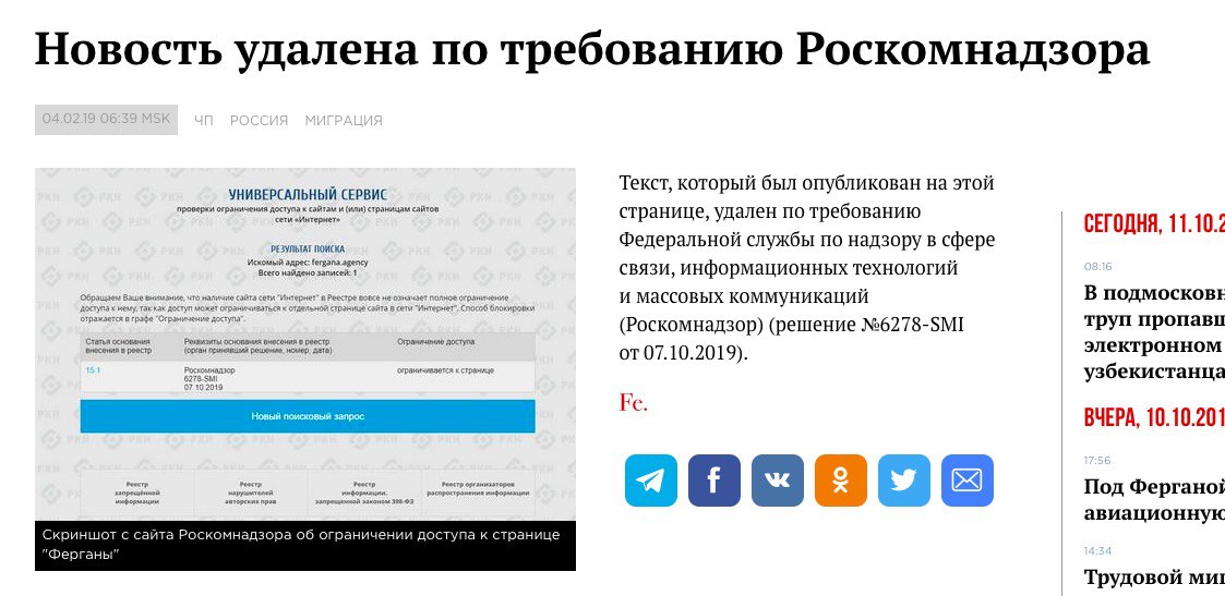Скриншот новости «Ферганы» про [Роскомнадзор] мигранта