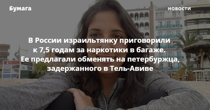 Химкинский суд Москвы признал виновной в хранении наркотиков 25-летнюю гражданку Израиля и США Нааму Иссахар, которая делала пересадку в Москве. Российские власти предлагали Израилю обменять ее на петербуржца Алексея Буркова, задержанного по делу о хакерской деятельности в Тель-Авиве четыре года назад, сообщает The Jerusalem Post.