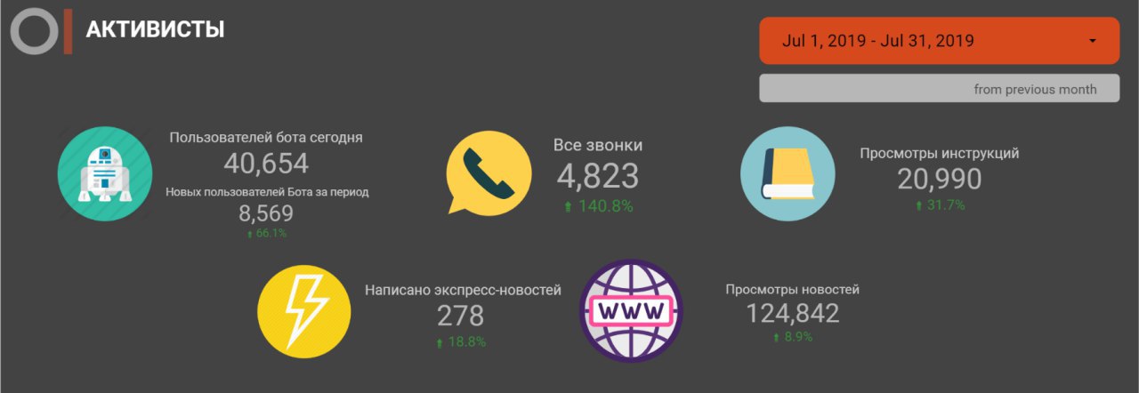 Дашборд объединил все показатели проекта и обеспечил равный доступ ко всем данным. Сейчас, кликнув пару кнопок, участники команды ОВД-инфо могут сразу понять, например, что выросло количество звонков на горячую линию, и нужно посадить еще одного оператора.