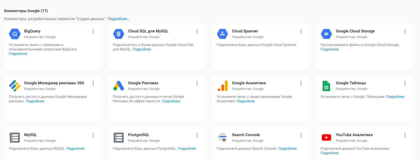 Как уже было упомянуто выше, с помощью GDS можно подключать к одному отчету несколько коннекторов. Для построения дашборда также можно совместить несколько источников данных. Для этого нужно подключить все коннекторы (максимум 5), которые вы планируете использовать в работе, а затем на их основе создать смешанный источник.