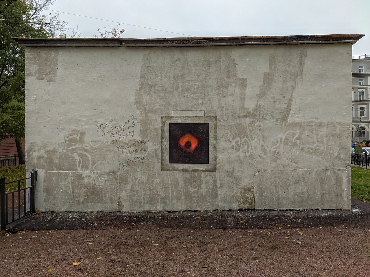 На Греческом проспекте на месте закрашенного ранее портрета американского музыканта Би Би Кинга появился стрит-арт с черной дырой. Об этом рассказал автор новой работы Олег Лукьянов в соцсетях.