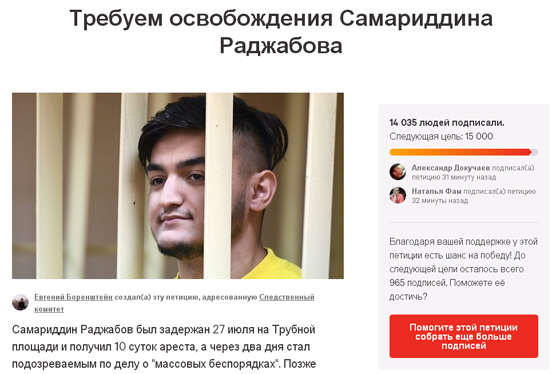 К 12:30 мск 16 октября петиция за освобождение Самариддина Раджабова собрала 14 тысяч подписей на Change.org, более 230 тысяч человек подписали петицию за отмену «московского дела».
