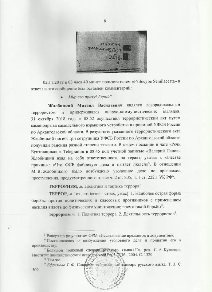 Исследуя репостнутый девушкой комментарий, где проводились параллели между действиями Жлобицкого, политикой властей в современной России и анархистами XIX века, эксперт ФСБ сообщает, что для владельца страницы анархисты с динамитом – это славные герои, самоотверженно отдававшие свою жизнь. «Автор в категоричной форме утверждает, что власть говорит с молодежью на языке насилия, то есть пресуппозиция высказывания содержит суждение о том, что на насильственные действия со стороны власти необходимо отвечать насилием, и именно так поступают настоящие герои», – делает вывод Ольга Гурина. Также, по ее мнению, автор комментария «апеллирует к инстинкту самосохранения и чувству безопасности адресанта» и «внедряет фактологическую информацию в концептуальную».