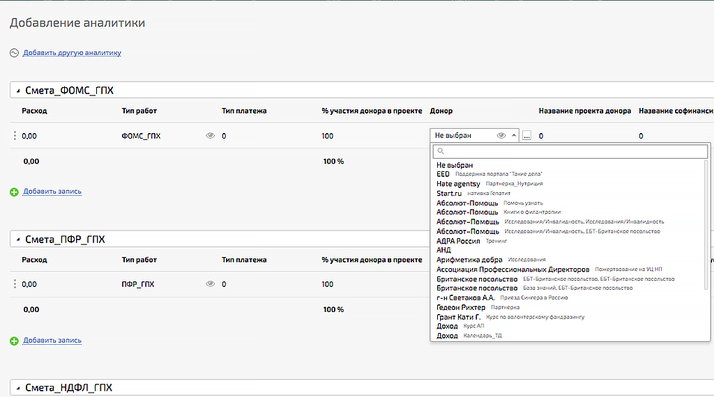 Донор – это обязательное поле аналитики. Донором мы называем любое денежное поступление от физического или юридического лица. Без него расход не пройдет. Тут важно не только, кто дал денег, но и на какой проект. Кроме того, в качестве донора указывается наше софинансирование по конкретным проектам. Мы проставляем процент участия, а «Планфикс» нам автоматически рассчитывает долю в рублевом эквиваленте.