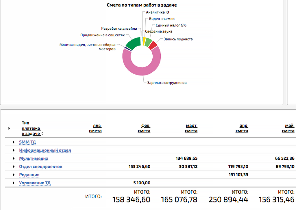 То есть бюджет этого проекта формируется в отделе редакции, но туда закладываются финансовые и временные расходы других отделов (по согласованию с ними). Кроме бюджетов проектов, у отдела могут быть текущие расходы. Чаще всего это зарплаты штатных сотрудников.