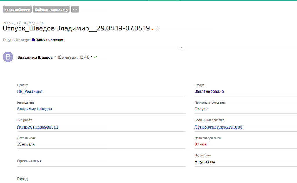 2. Создание цепочки согласований отсутствия. Самим отсутствием заведует наш HR-менеджер, финансовые же операции и логистику делает другой сотрудник, что прописано в автоматических сценариях основной задачи на отсутствие и ее чек-листе.