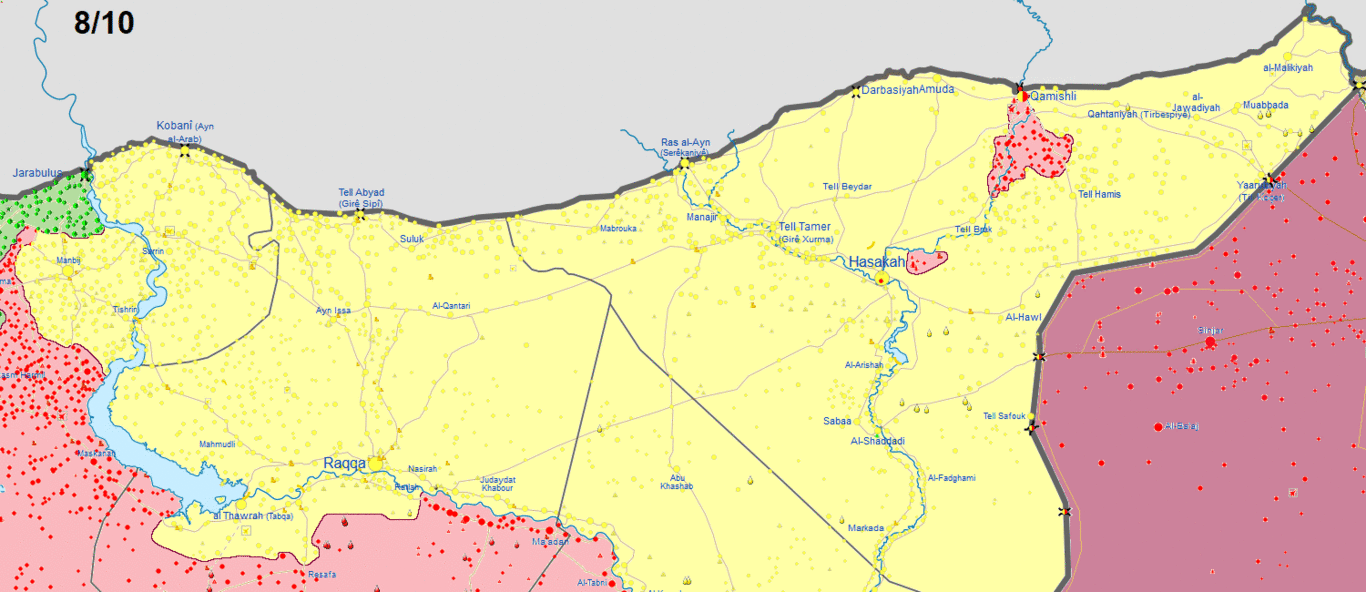 В 2016 году сирийская армия и российские военные начали операцию по взятию крупнейшего города страны Алеппо, половину которого удерживала коалиция исламистов и «умеренных» оппозиционеров. Отряды «Исламского государства», оставшиеся в тылу у сирийских войск, воспользовались тем, что городские бои за Алеппо затянулись и потребовали концентрации почти всех боеспособных сирийских сил. Боевики ИГ захватили недавно освобожденную Пальмиру и продвинулись к Дамаску, прервав важнейшие для сирийской армии дороги. Вернуть Пальмиру удалось только после захвата Алеппо в декабре 2016 года. То, что наступление в направлении реки Евфрат пришлось отложить, сыграло на руку курдам и американцам. Они начали наступление раньше и получили контроль над восточным берегом реки Евфрат с богатыми месторождениями нефти и газа.