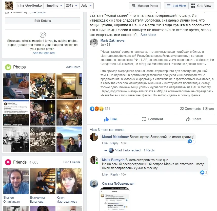 Родственники убитых журналистов были шокированы столь изощренным дипломатическим языком и даже пытались объяснить это в комментариях к посту. Однако Мария Владимировна их игнорировала. Я же ответила Захаровой на своей странице, указав, что немного разбираюсь в «деталях следственного процесса», так как являюсь потерпевшей. Сообщила о том, что пишу со слов следователя. И спросила, почему же Захарова возмутилась только 31 числа, а не 17 июля, когда я впервые обнародовала факты бездействия МИД России.