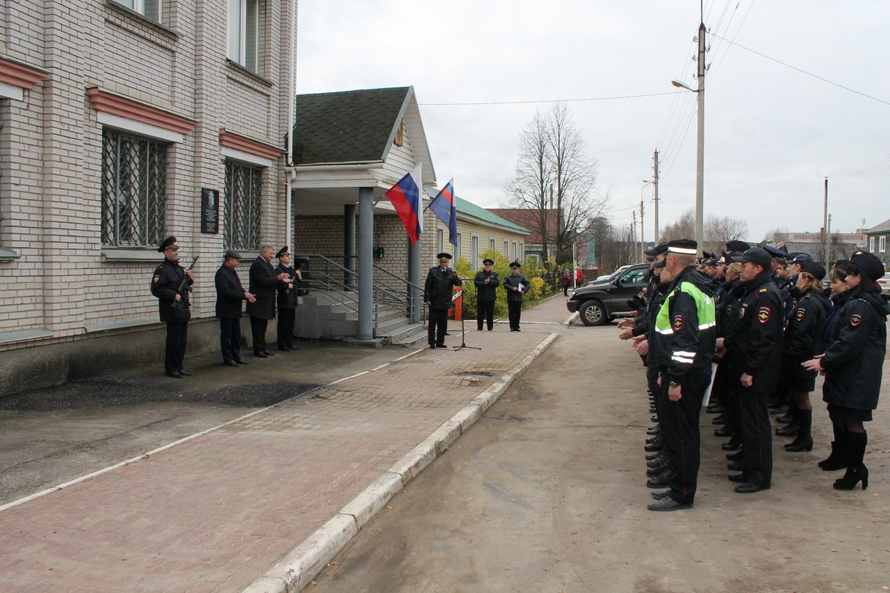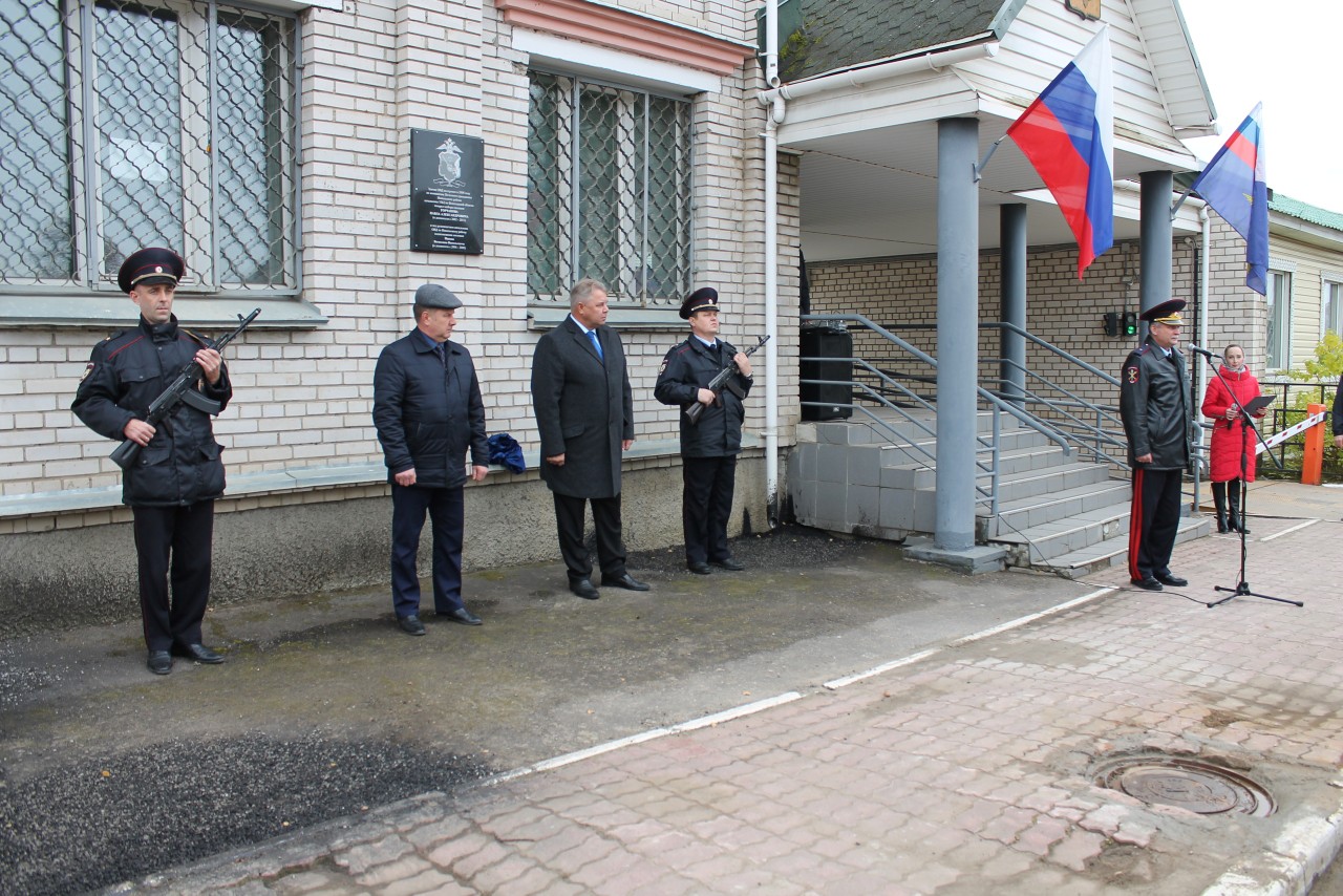 На доске написано: "Здание ОВД построено в 2008 году по инициативе Почетного гражданина Никольского района начальника УВД по Вологодской области генерал-майора милиции ГОРЧАКОВА ПАВЛА АЛЕКСАНДРОВИЧА (в должности с 2002-2011) и под руководством начальника ОВД по Никольскому району подполковника милиции Панова Вячеслава Васильевича (в должности с 2006-2008)".