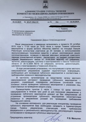 Девушка планировала провести 30 октября «молитву памяти» жертвам репрессий в форме митинга с количеством участников до 30 человек на площади Борцов Революции. Петрунина подала уведомление о проведении мероприятия, однако в городской администрации отказались его согласовать.