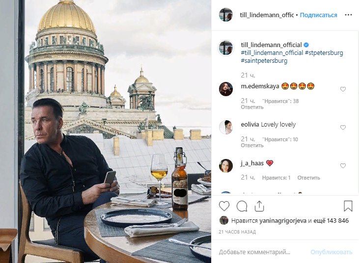 Похоже, Линдеманн по-прежнему в Петербурге. 20 октября он опубликовал фотографию из ресторана с видом на Исаакиевский собор.