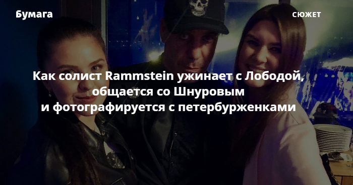 В Петербурге уже больше недели находится солист немецкой группы Rammstein Тилль Линдеманн. Сначала его заметили на концерте «Ленинграда», затем на студии «Ленфильм», а еще — на дне рождения певицы Светланы Лободы. Сам музыкант свои планы не афиширует, но СМИ пишут о съемках клипа для его сольного проекта.