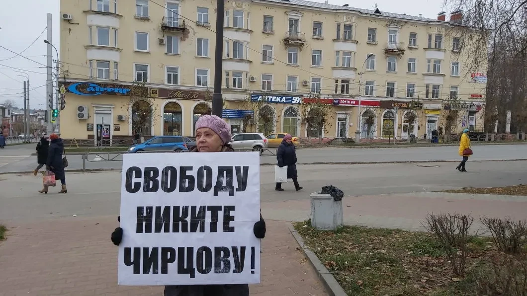 Надежда Сергеевна Ложкина почти каждый день выходит на пересечение улиц Пятилетки и Карла Маркса в Березниках с большим плакатом «Свободу Никите Чирцову!» «Не могу ничего не делать, — говорит она. — Когда постою, мне легче становится. Хоть этим поддержу Никиту, все равно он чувствует, что мы его поддерживаем».