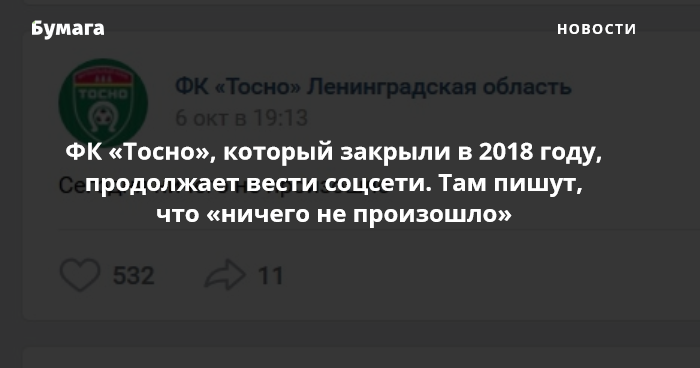 Футбольный клуб «Тосно» из Ленобласти, о закрытии которого объявили летом 2018 года, продолжает вести группу во «ВКонтакте». С начала октября публикации там появляются ежедневно.
