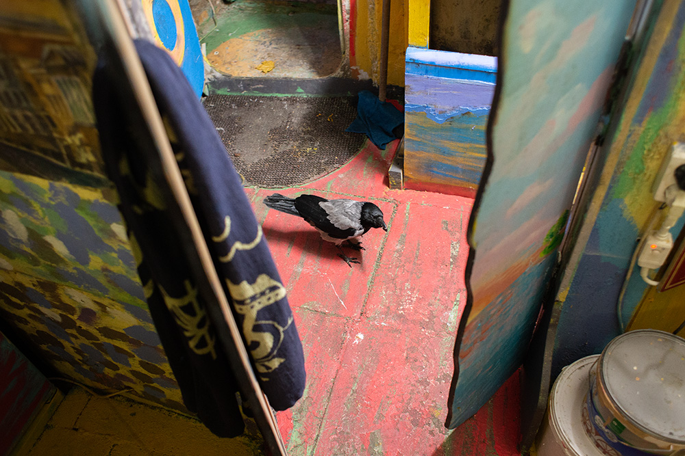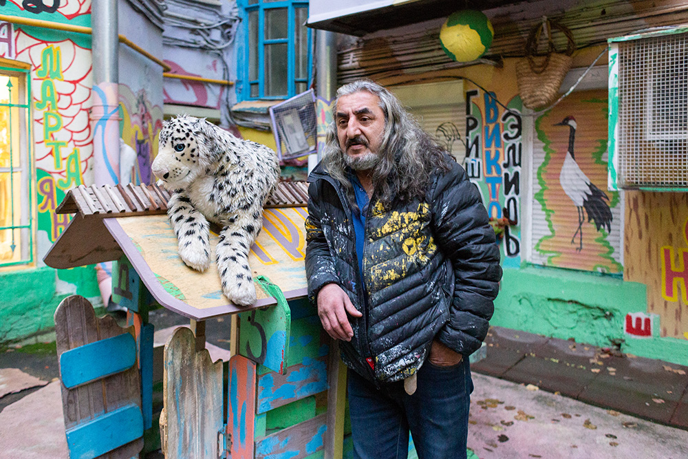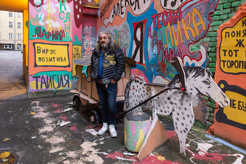 Среди этого разнообразия легко не заметить подсобку с надписью «Храм Песни» — здесь живет создатель рисунков Нельсон Искандарян. В полуподвальном помещении на Петроградской стороне художник поселился в 2011 году. Внутри там не менее красочно, чем во дворе: стены разрисованы желтым, синим и зеленым, над кроватью написано «фобия» и «предназначение». Под потолком растут цветы — зеленые, несмотря на недостаток солнца. Полки заставлены статуэтками животных, рядом лежат горы блокнотов с записями.