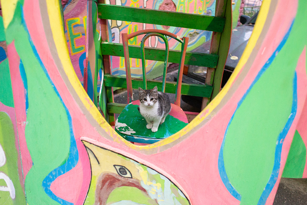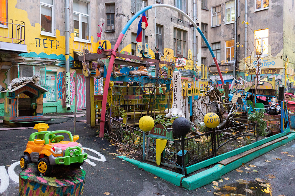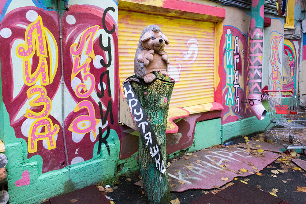 На Полозовой улице есть дворик Нельсона — с деревянными скульптурами, плюшевыми игрушками и узорами на стенах. Его создал бездомный поэт Нельсон Искандарян, который живет в полуподвале неподалеку.