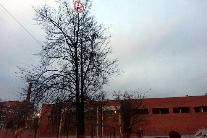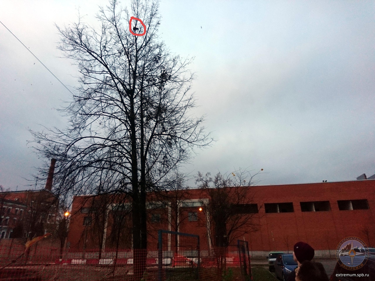 Животное забралось на верхушку дерева, растущего у котлована. Спасатели пытались достать его оттуда, предварительно установив тенты, но кот спрыгнул сам, при этом не пострадав.