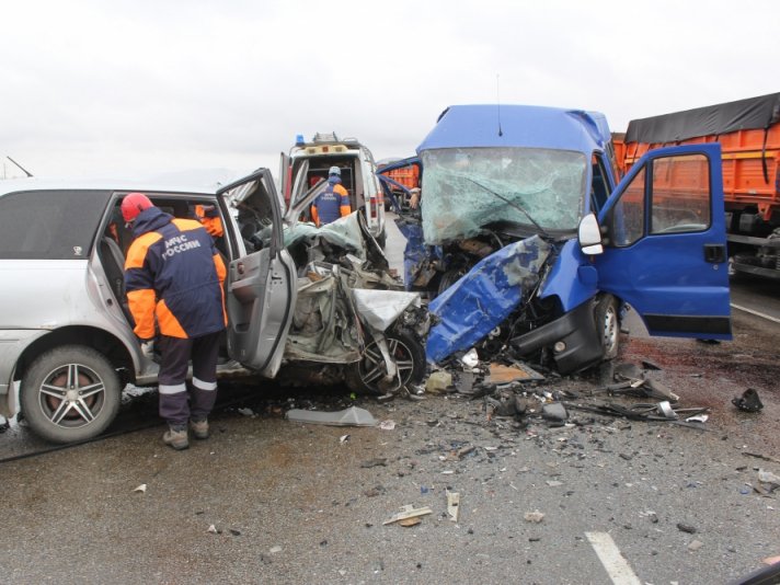 РИА «ФАН» опубликовало кадры с места аварии. На них видно, что автомобили очень сильно пострадали. Минивэн разбит практический полностью. Столкнувшиеся автомобили заняли практически всю трассу.