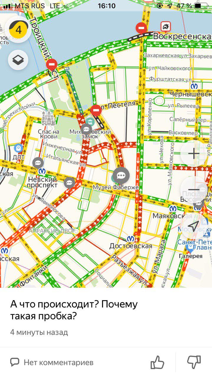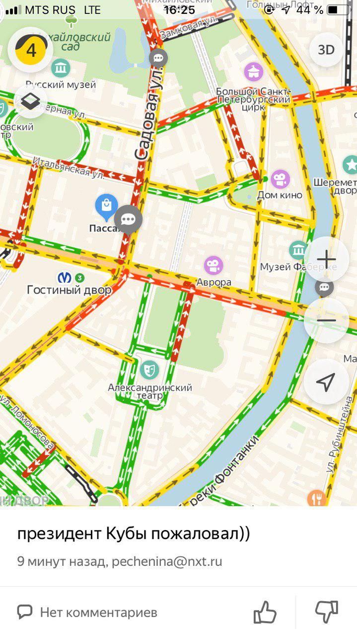 Пробки могут быть связаны с приездом в Петербурга президента Кубы Мигеля Диас-Канель. Водители жаловались на перекрытия по пути кортежа. В понедельник президент должен встретиться с губернатором Александром Бегловым.