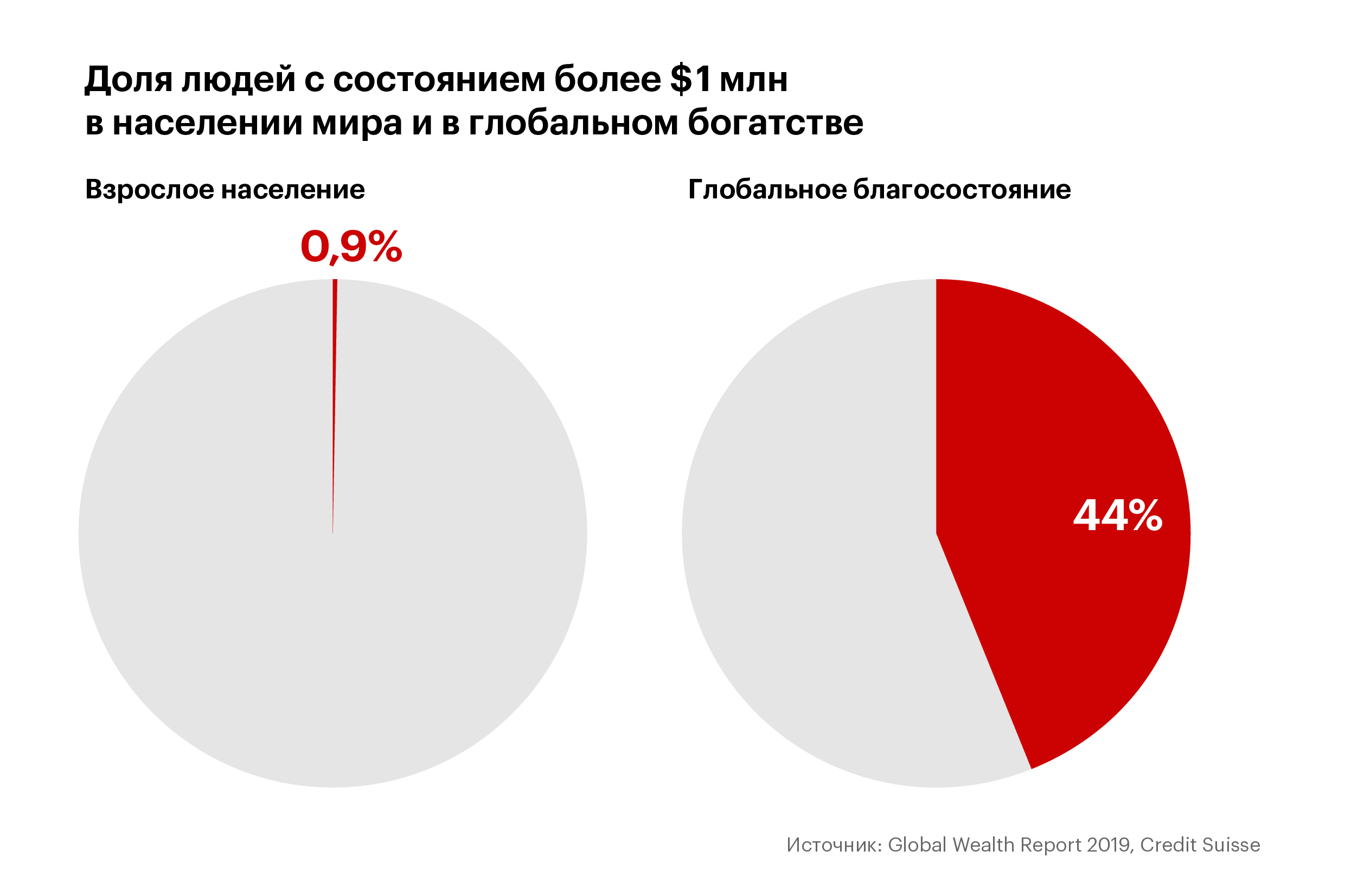 На долю 10% самых состоятельных россиян приходится 83% богатства страны, следует из отчета Credit Suisse о глобальном благосостоянии — 2019. Это больше, чем у Китая и США, зато почти на одном уровне со среднемировым показателем. А чтобы быть богаче половины взрослого населения Земли в этом году, достаточно иметь всего около $7000. Об этом и других выводах знаменитого исследования о мировом богатстве рассказываем в 10 графиках, которые нарисовали наши партнеры с экономического портала Econs.