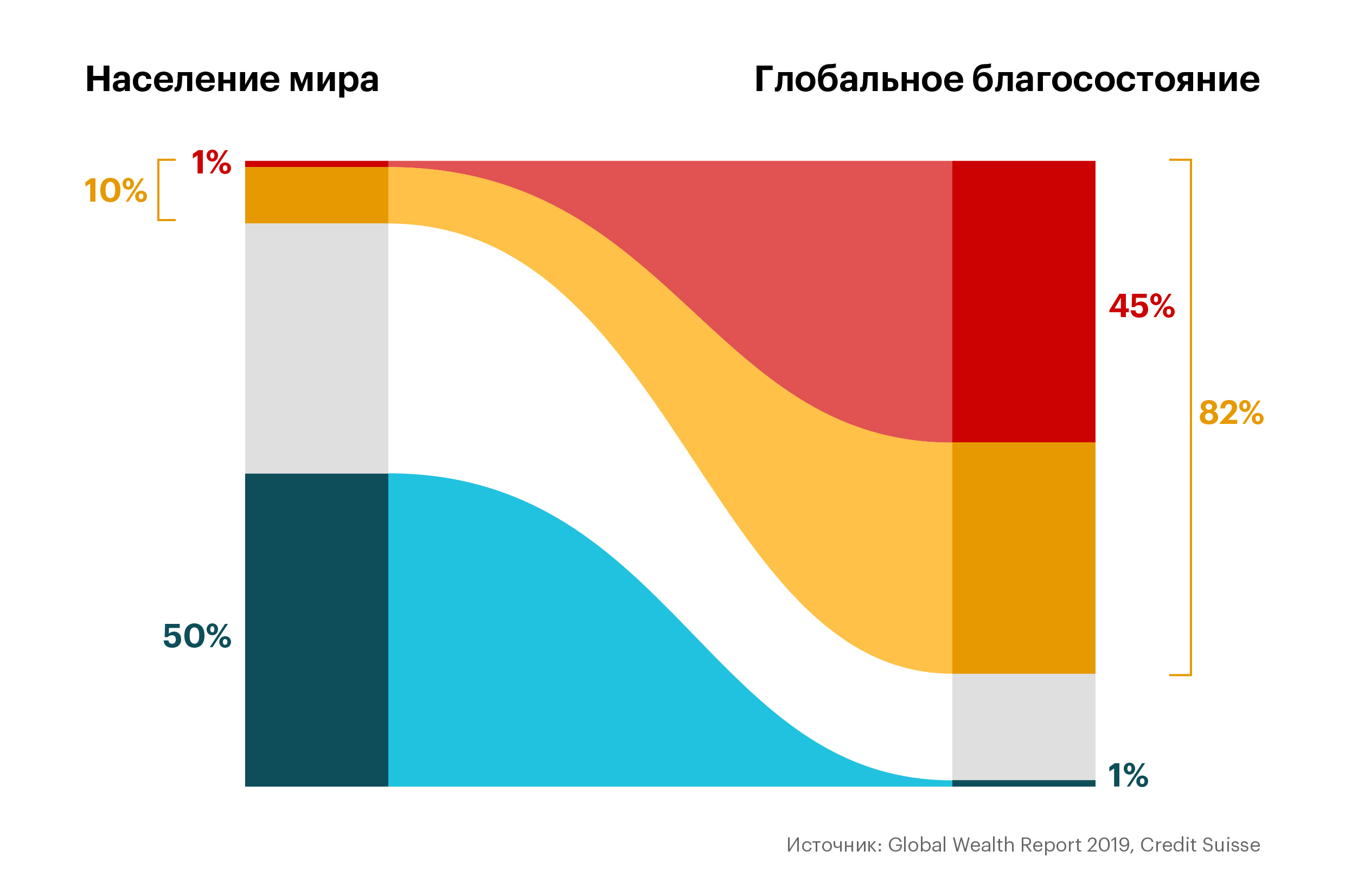 Нижние 50% людей в глобальном распределении благосостояния владеют менее чем 1% глобального богатства. На долю верхних 10% приходится 82% глобального благосостояния. А на долю самого богатого 1% — 45%.