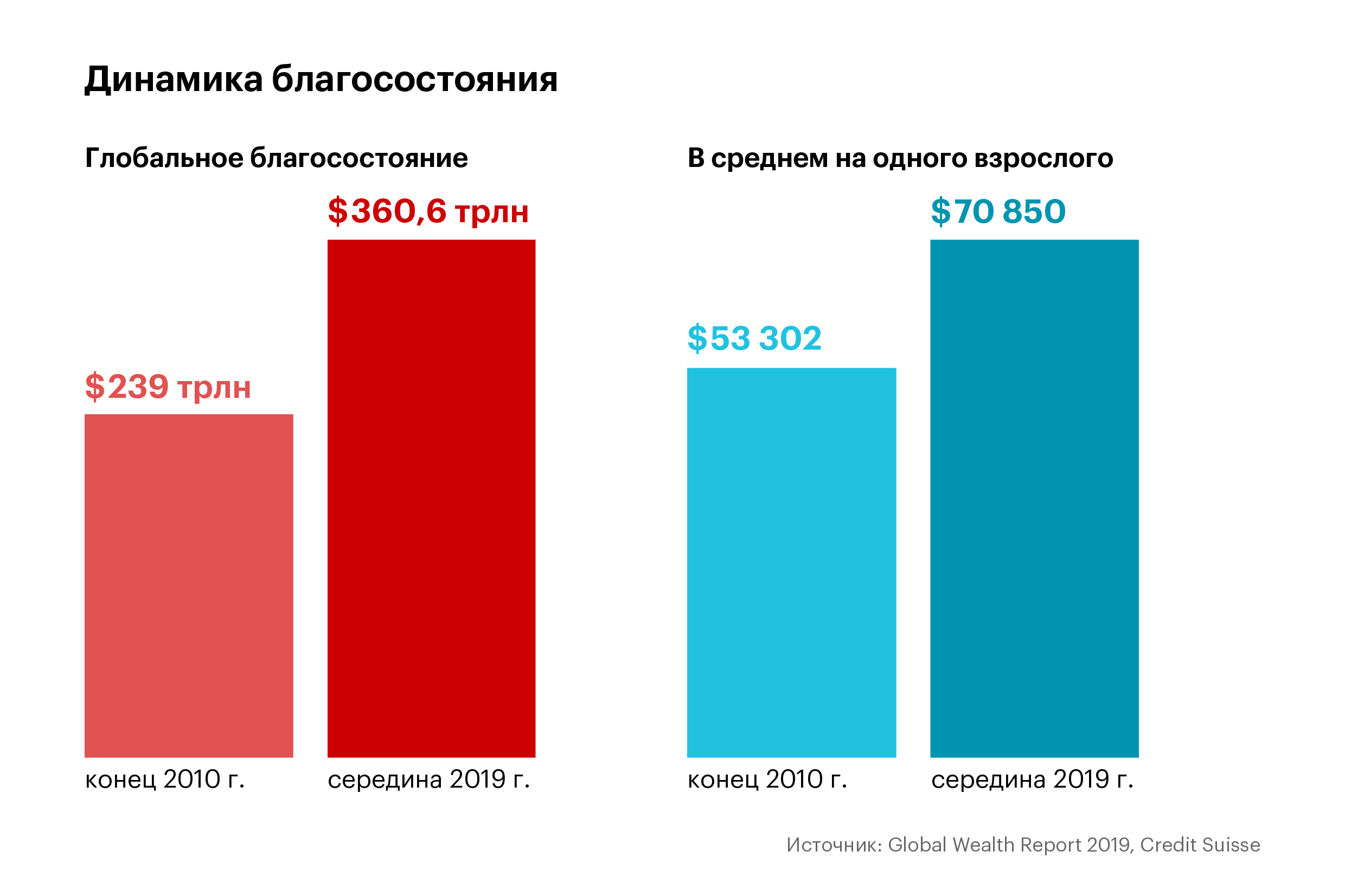 Глобальное благосостояние за десять лет, к середине 2019 года, возросло на 70%, до $360,6 трлн. Это $70 850 в пересчете на каждого взрослого.