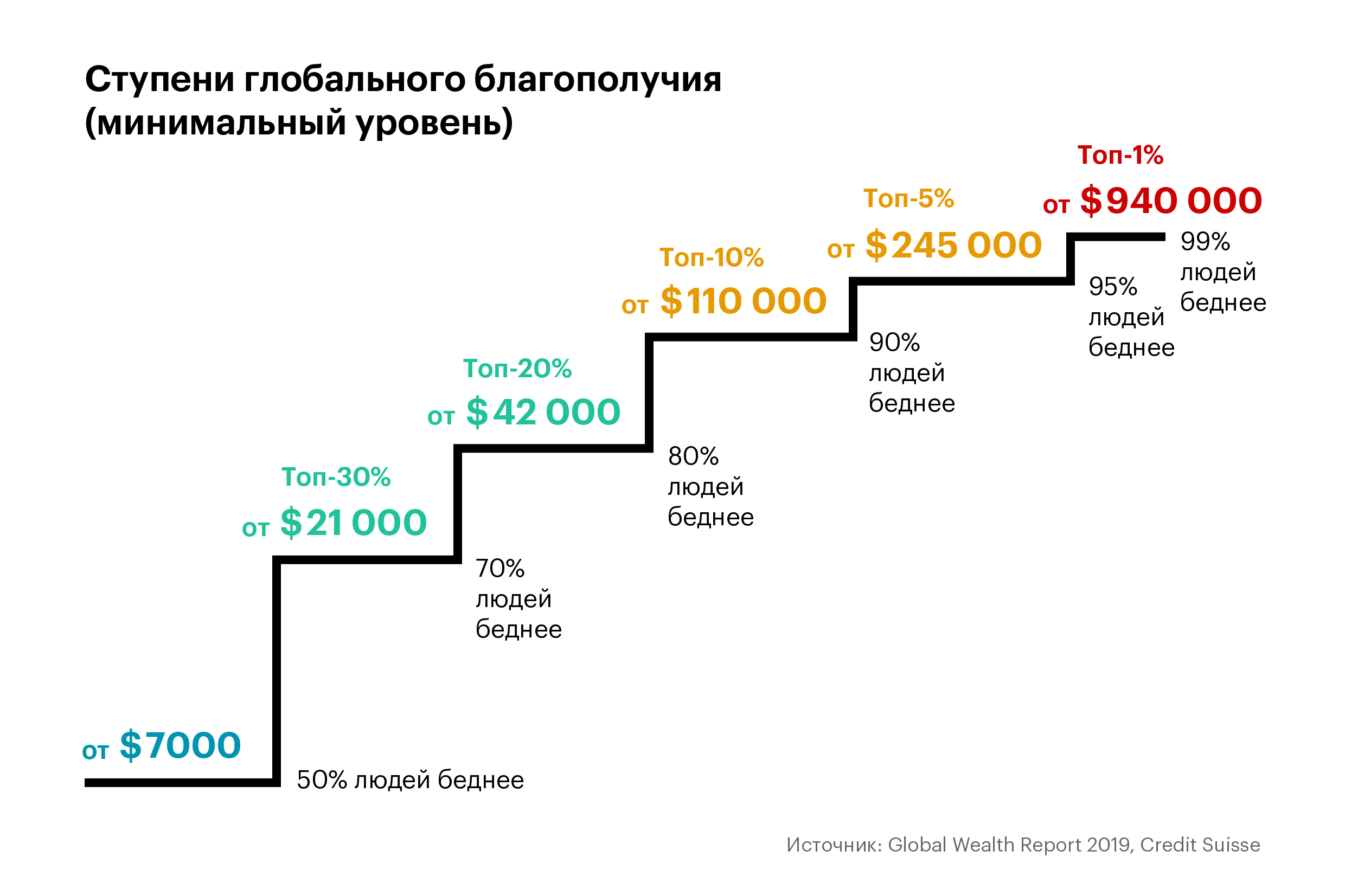 Чтобы быть богаче половины населения Земли, достаточно иметь чуть более $7000 (в оценку входят как финансовые, так и нефинансовые активы — например, недвижимость). Располагающие около $21 000 попадают в топ-30% самых обеспеченных жителей планеты. Имеющие чуть более $42 000 — в топ-20%. Те, чье благосостояние составляет порядка $110 000, богаче, чем 90% населения мира; владеющие активами на $245 000 — богаче 95% людей. Порог «входа» в топ-1% самых богатых людей планеты — около $940 000.