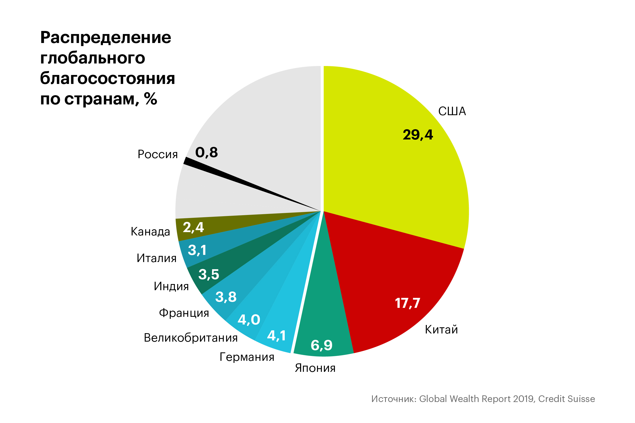 В географическом распределении богатства лидируют США: их доля мирового благосостояния — 29,4%. На втором месте Китай — 17,7%. Япония владеет 6,9% мирового богатства. Россия — 0,8%.