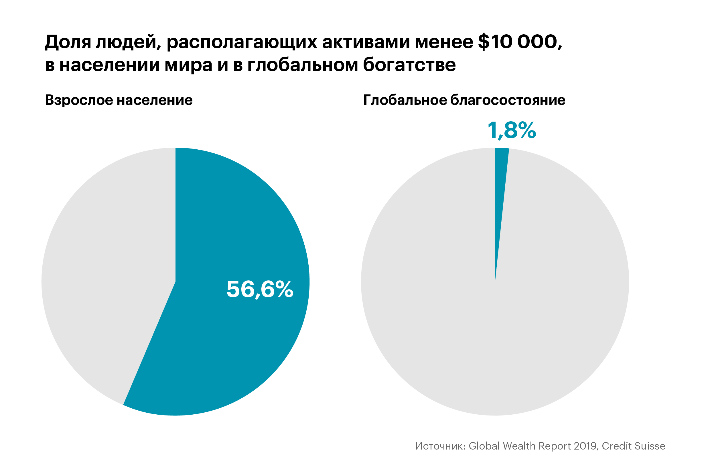 Более половины взрослого населения мира — 2,8 млрд из 5,1 млрд человек — располагают в среднем менее чем $10 000. Совокупно на их долю приходится менее 2% глобального благосостояния.