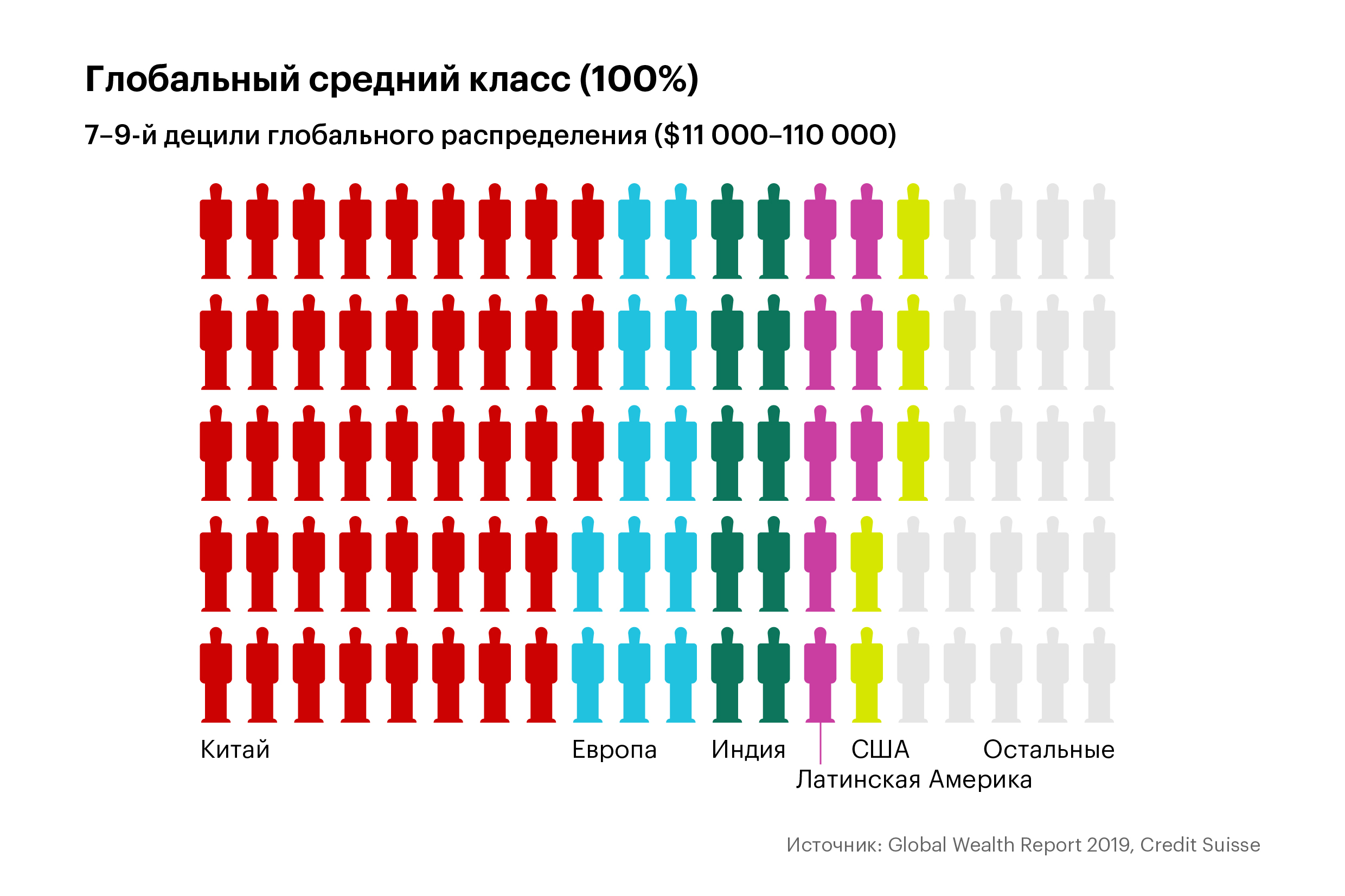 Глобальный средний класс — треть населения мира с благосостоянием от чуть более $11 000 до порядка $110 000 — почти наполовину состоит из жителей Китая. На долю глобального среднего класса приходится почти 16% мирового благосостояния, в самом Китае к этой группе относятся две трети граждан.