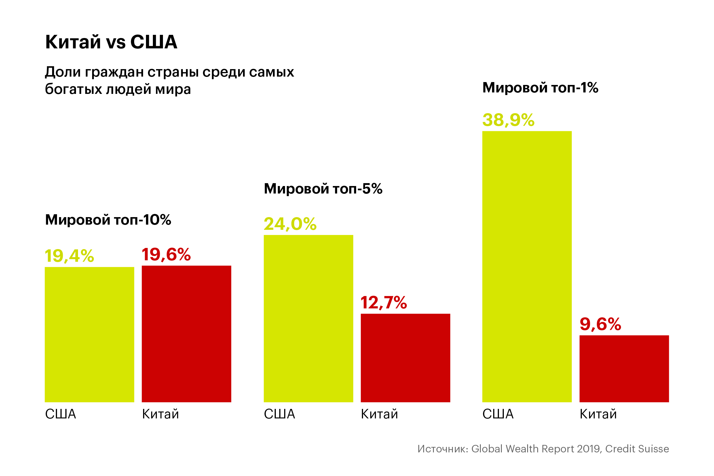 За прошедшее десятилетие рост глобального благосостояния был сконцентрирован в Китае и США. На США приходится порядка 40% долларовых миллионеров мира и почти 40% тех, кто находится в верхнем 1% глобального распределения богатства. Китай в 2019 году обогнал США по числу граждан, входящих в топ-10% самых состоятельных людей мира.