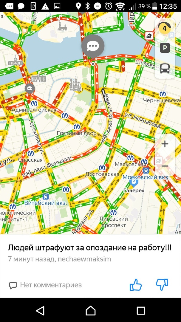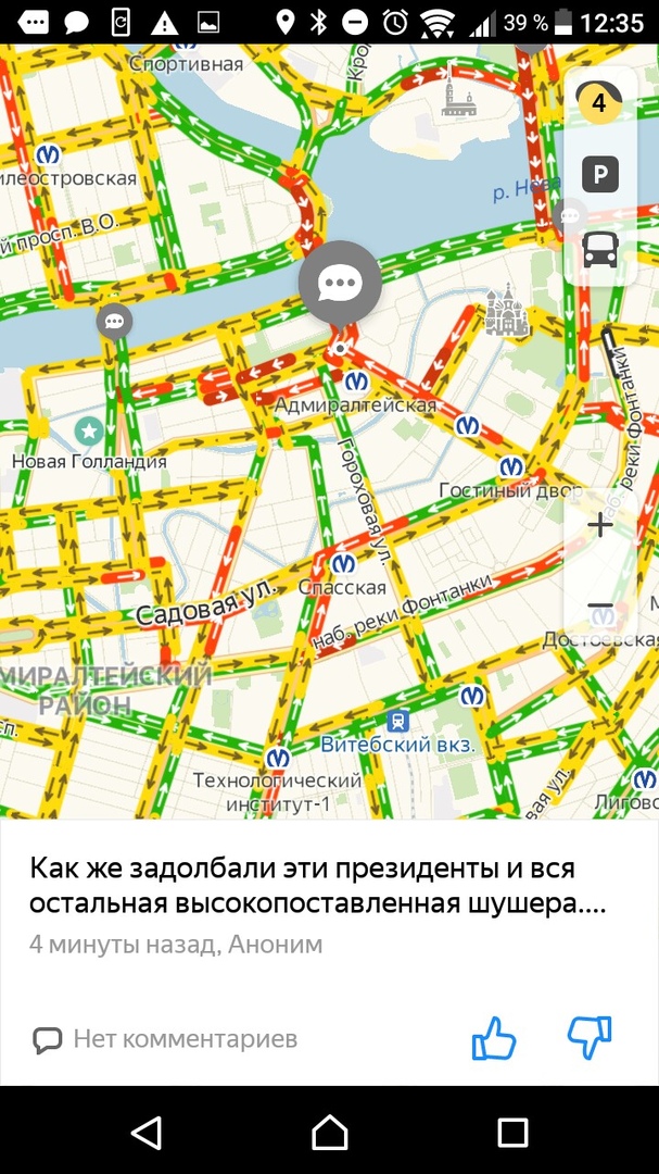 Очевидцы пишут, что перекрыты участки набережной реки Фонтанки, а также набережных Кутузова и Воскресенской. Позже на Невском проспекте, Садовой улице, а также у Исаакиевского собора и станции метро «Площадь Восстания» образовались пробки.