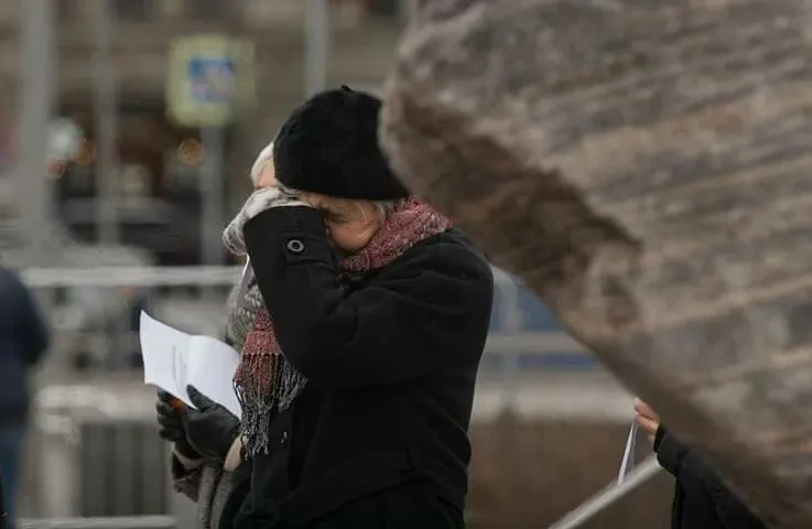 Люди держат в руках свечки, кто-то цветы. Среди пришедших много молодежи. Есть даже те, кто привел с собой маленьких детей. Сотрудники «Мемориала» раздают желающим горячий чай. На площади расставлены специальные обогреватели.