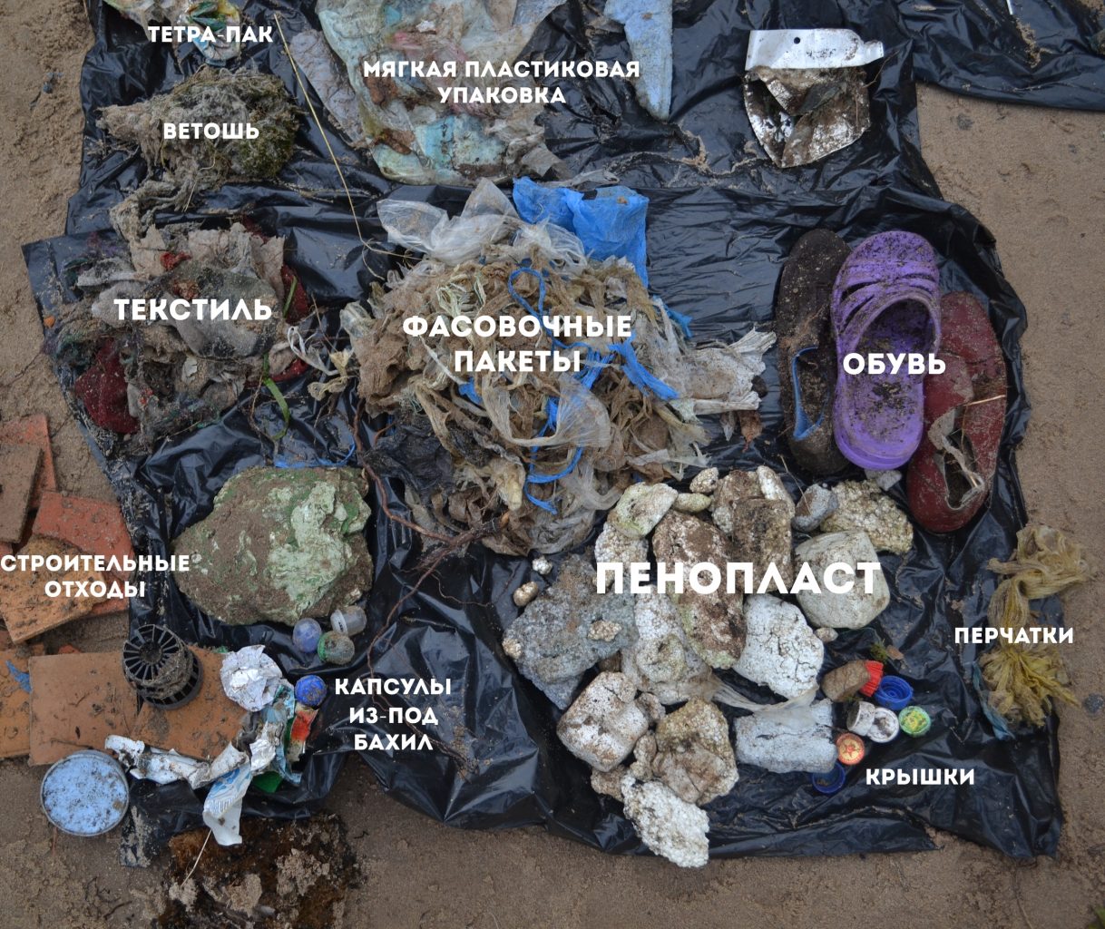 В мусоре оказалось все: бутылки в большом количестве, одноразовая посуда, пенопласт, строительные материалы, обувь, ткани. Мы даже нашли три капсулы от бахил и остатки конфетти.