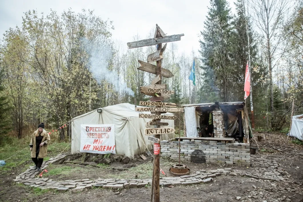 Чуть глубже в лесу пару месяцев назад вырос пост «Брестская крепость». В июле на месте заброшенного поселка Шиес, от которого осталось только несколько остовов домов, нашли колодец с питьевой водой. В поселке жили рабочие, занимающиеся лесозаготовкой, и их семьи. Когда в 70-х годах работы на этом участке закончились, людям пришлось уезжать. Поскольку колодцем не пользовались с тех самых пор, активистам пришлось долго вычерпывать из него всю воду и убирать грязь со дна. Очистив колодец, люди организовали пост: они опасаются, что иначе сотрудники ЧОПа смогут лишить их источника питьевой воды, специально испортив его.