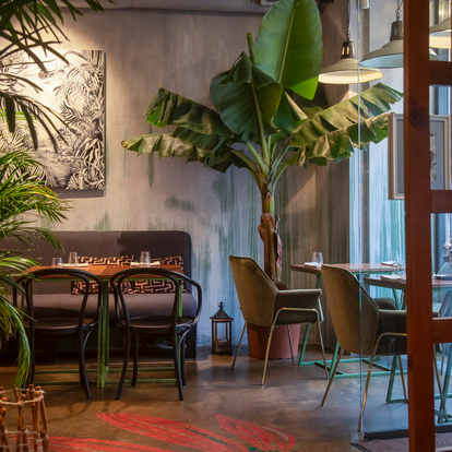 — Ощущается как колониальные времена: зеленые, облитые белой краской стены, огромные, в потолок упирающиеся, не побоюсь сказать, кусты и деревья в сочетании с грубоватой мебелью, резными зеркалами, развешенными по всем стенам и цветным клеймом-меткой на полу — вся эта обстановка дает ощущение, что ты далеко от Петербурга. Зато о времени не забудешь — в углу винтажные часы «Электроника» <…>