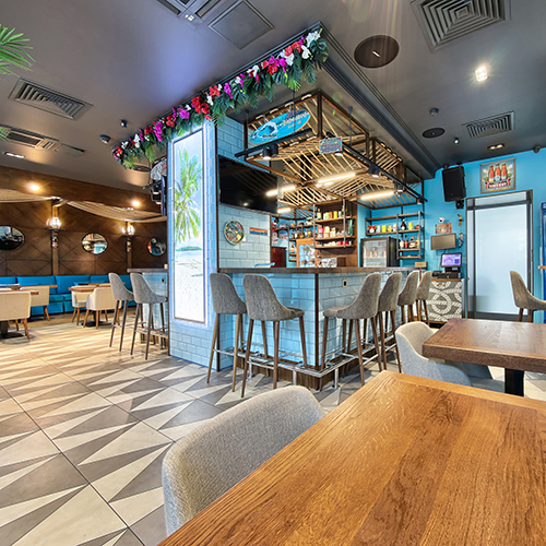 — Ярко, красочно, по-гавайскому. Голубые стены и диваны, пальмы. В меню гавайские блюда, а в винной карте гавайское пиво с изображением серфингиста на этикетке