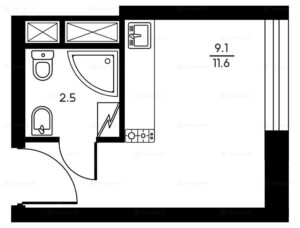 - Судя по плану похожего проекта, на совмещенный санузел без ванны приходится 2,5 кв. м, на оставшееся помещение — 9,1 кв. м.