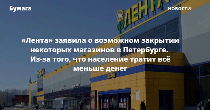«Лента» может закрыть нерентабельные гипер- и супермаркеты в Петербурге и в других регионах. Об этом на конференции заявил финансовый директор компании Руд Педерсен, передает «РБК».