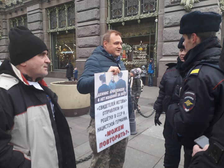 В Петербурге на Невском проспекте прошла серия одиночных пикетов в поддержку Свидетелей Иеговы прошла на Невском проспекте. Организаторы – группа гражданских активистов – подчеркивают, что акция носит не религиозный, а правозащитный характер, цель которой – напомнить о том, что российская Конституция гарантирует всем свободу совести. Активисты напомнили своими плакатами, что Свидетелей Иеговы преследовали и в СССР, и в нацистской Германии. Новая волна преследований началась весной 2017 года, когда "Управленческий центр Свидетелей Иеговы в России" признали экстремистской организацией и запретили в стране.