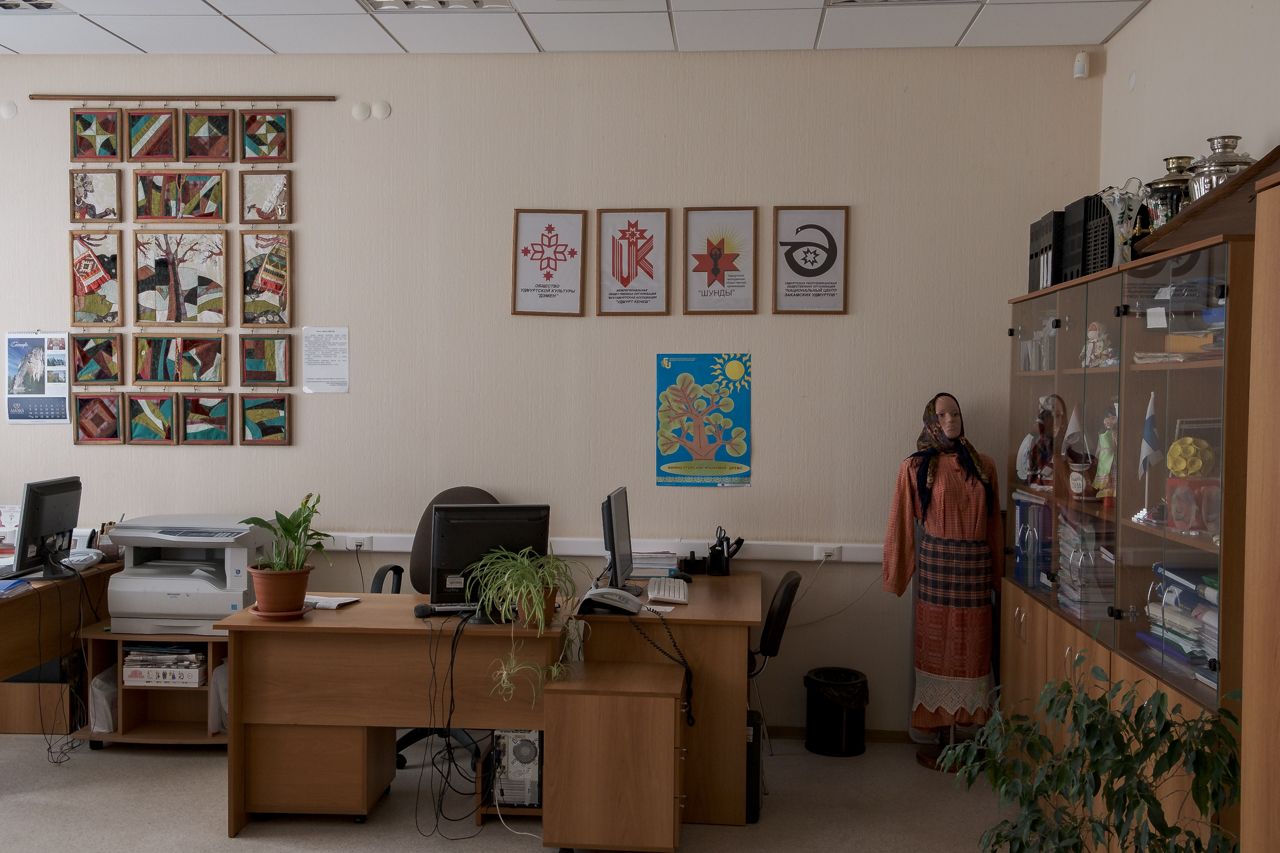 Buranova called the ballroom — with its three massive chandeliers, its enormous table, and its cushioned chairs on a parquet floor — “one of the most luxurious, beautiful halls in the entire republic.” However, the House of the Friendship of Peoples doesn’t just host weddings and other special events: There are trained specialists who work here to help Udmurt organizations handle their funds, write scripts for traditional holiday plays, and acquire any literature they might need.