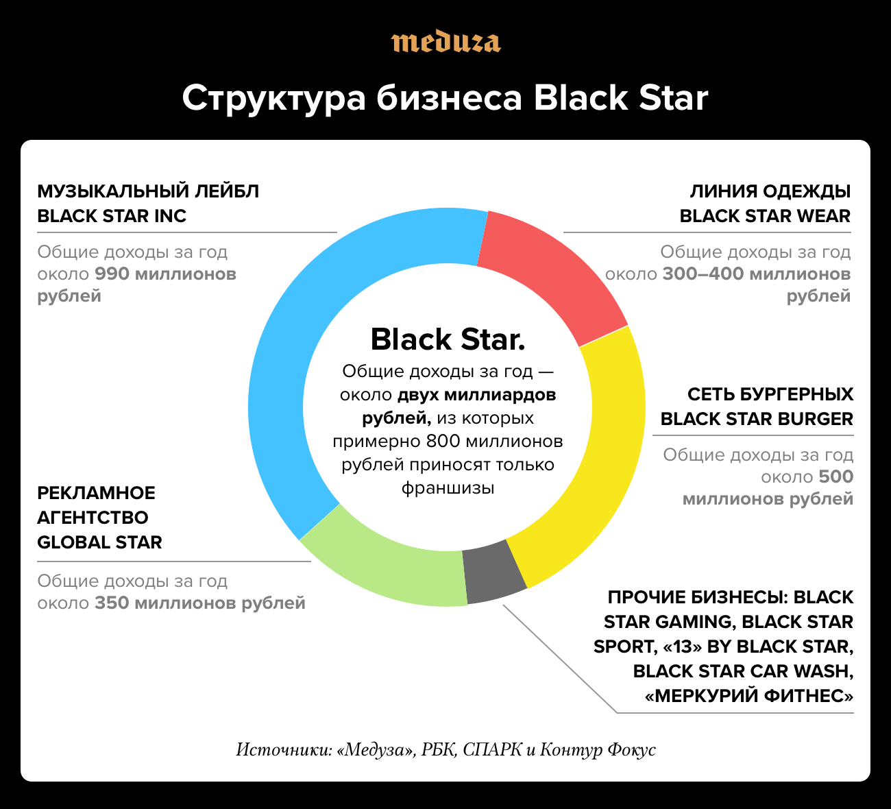 Музыкальный лейбл Black Star Inc. Общие доходы за год — около 990 миллионов рублей. Общие расходы за год — около 750 миллионов рублей