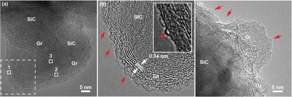 Сотрудники Аризонского университета провели эксперимент по формированию фуллеренов на поверхностях частиц размером от 45 до 65 нм из карбида кремния, который, как предполагается, является одним из основных компонентов пыли, образующейся в оболочках проэволюционировавших звезд, богатых углеродом. Образцы нагревались до температуры 1000 °C, а затем подвергались бомбардировке ионами ксенона с энергией 150 кэВ. Эти условия примерно соответствуют ударным волнам в оболочке проэволюционировавшей звезды. Нагрев и облучение привели к изменению свойств поверхности частиц, а именно к образованию в их внешних оболочках графитовых слоев. Шестиугольная структура графита вполне соответствует кристаллической структуре использованной модификации карбида кремния. А вот в местах дефектов кристаллической решетки SiC образовывались полусферические и квазисферические пузырьки диаметром около 0,7 нм, для построения которых нужны уже пяти- и семиугольные структуры из атомов углерода (рис. 4). Эти пузырьки вполне могут оказаться будущими фуллеренами.