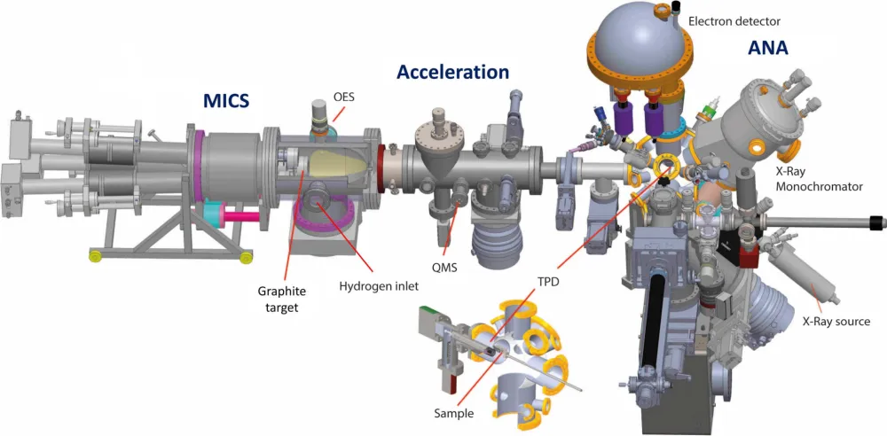 Для проведения эксперимента использовалась установка Stardust (рис. 2) — многофункциональная машина для исследования процессов в околозвездной среде. В условиях ультравысокого вакуума (он нужен, чтобы избавиться от атмосферных газов) сначала производилось испарение атомов углерода (из графита бомбардировкой атомами аргона) до концентрации порядка 2,5×1010 частиц в см3, а затем к ним примешивался молекулярный водород. Авторы рассмотрели два случая: в первом молекулярный водород добавлялся примерно в равном количестве с углеродом, во втором его концентрация превышала концентрацию атомов углерода на два порядка. Идея состояла в том, чтобы в реакциях принимали участие только атомарный углерод и молекулярный водород; никаких посторонних газов, никаких изначально присутствующих углеводородных молекул (как это бывает при горении углеводородного топлива).