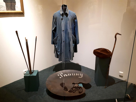 © А. Семенович Мемориальные вещи И. Репина из усадьбы «Пенаты» Московская выставка была традиционно богаче и мощнее петербургской. Не только за счет более современных залов, но и в силу явного желания восхитить, ошеломить зрителя, наполнить гордостью — разом за живопись, литературу, общественную мысль — за все «великое русское». В Москве кураторы позволили себе жест, который вне контекста мог показаться излишне театральным: выставили пустую стену на месте злополучного «Ивана Грозного». В Третьяковке Репина показывали на щитах цвета глинистой почвы; теплый, плотный колорит сопровождал художника от академического периода до поздних вещей, которые петербуржцы привыкли видеть в «Пенатах» (усадьба художника в поселке Куоккала/Репино, в которой он жил с начала XX века; в 1918 году она оказалась на территории независимой Финляндии). Русский музей выступил более сдержанно, самим выбором вещей прививая зрителю исследовательскую логику, а в оформлении экспозиции показывая практичность: разместив репинские работы на щитах с выставок, например, Василия Верещагина или «Карл Маркс навсегда».