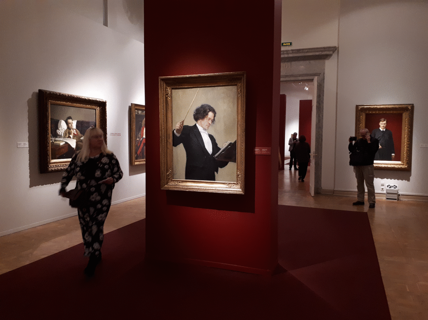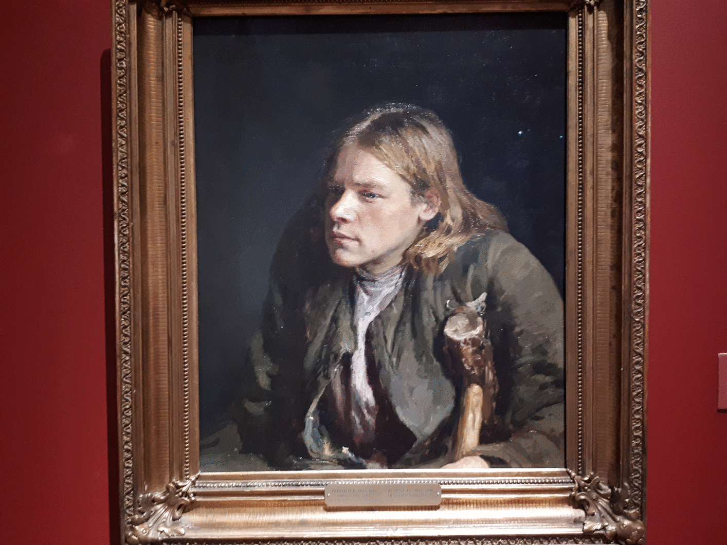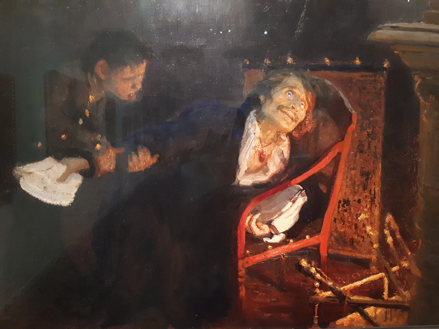 В России стоит навестить «Пенаты» — нынче репинская усадьба находится в сорока минутах на электричке от Петербурга. Это уютный дом недалеко от станции Репино, похожий на старую интеллигентскую дачу, где вам расскажут, как Илья Ефимович круглый год спал на воздухе — даже зимой с открытыми окнами — и писал длиннющими кистями под конец жизни. Отсюда прибыл на выставку самый трогательный автопортрет художника — 1920 года, в похожей на детскую шапке, прикрывающей уши, с палитрой в руках. Холодный свет на теплом цвете, взгляд, по наблюдению Коровина, прямодушный, и как будто сине-голубые глаза — первый раз увидев портрет, я не поверила, что это работа Репина: настолько детско-стариковские взгляд и вид контрастируют с обычно тиражируемыми автопортретами мастера.