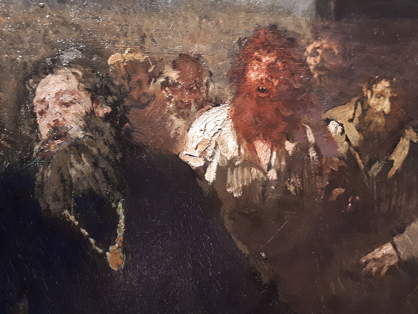 Если попытаться пробраться через десятилетиями конструируемые образы Репина и русского реализма, окажется, что художнику удавались выпуклые, характерные образы («Бурлаки», «Крестный ход в Курской губернии», «Запорожцы», «Большевики») и драматические моменты («Арест пропагандиста»); при этом большинство работ Репина скомпоновано так, будто это последний кадр эпизода захватывающего сериала, — настолько зрителю хочется знать, что дальше. А смотреть взахлеб можно историю хоть про Чернобыль, хоть про Мать драконов, про революционеров или царей. Также Репин смакует гротескные сценки и персонажей (драка в эскизном варианте «Крестного хода», вроде бы академический эскиз «Избиение первенцев египетских», герои второго-третьего плана). Строго говоря, Репин — это не вполне реализм, как и, например, Гоголь. Наверное, банальная параллель, но по ней видно, что традиционная повествовательность русской живописи не всегда сопутствует реализму или «служит гражданской скорби». Если Репина в жанре захватывает скорее фактура, нежели иллюстрация язв, то его герои не обязаны нас мучить, давить моралью на совесть и обездоленностью — на жалость (к разговору о Перове). Репин при всей отмеченной современниками темпераментности не морализаторствует и не судит. Именно это интуитивно ощущается как ментальная теплота его живописи и опять же примиряет зрителя с действительностью.