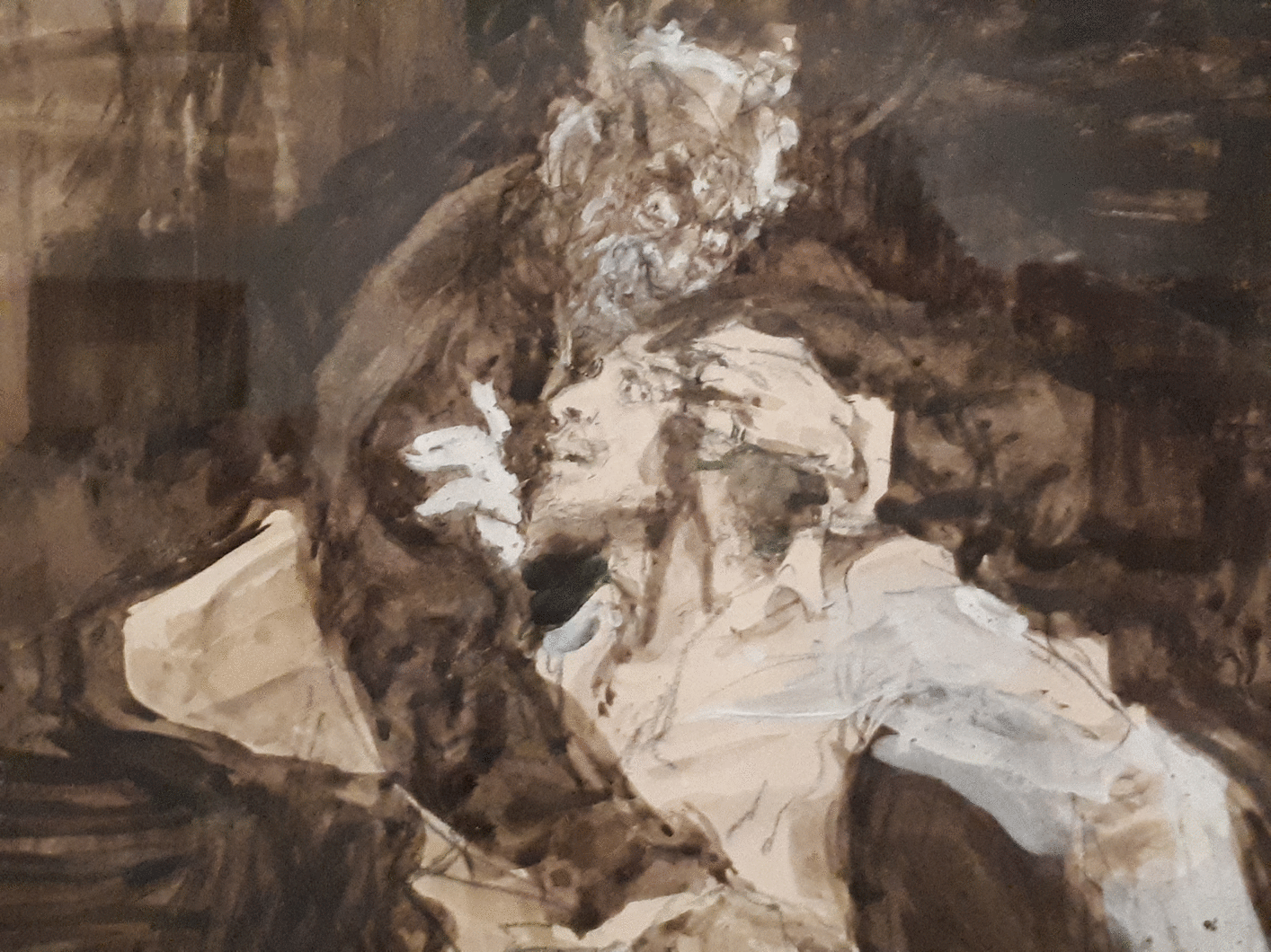Еще любопытнее наблюдать за подготовкой к вновь отсутствующему «Ивану Грозному». На графическом эскизе (который был и в Третьяковке) царь напоминает воина или духа с японской гравюры (или гипсовую голову экорше — «без кожи», с голыми мышцами) — так по-театральному контрастно Репин лепит мимику. При этом на подготовительном живописном портрете натурщика образ лишен этой «подсветки», а на итоговом полотне изображение ближе к графическом эскизу. Театральность Репина, как правило, называют способностью драматизировать, выстраивать не академическую композицию-конструктор, а мизансцену.
