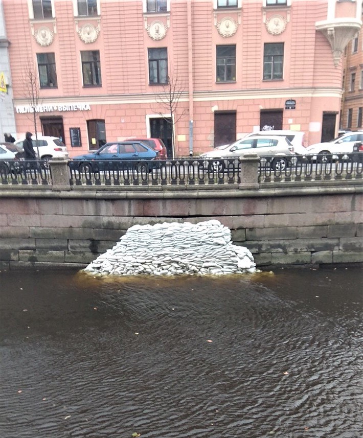 В конце сентября петербуржцы заметили на набережной канала Грибоедова подмыв — на месте гранитных блоков образовалась дыра. Теперь под просевшей набережной обнаружили десятки мешков, рассказали очевидцы в соцсетях.