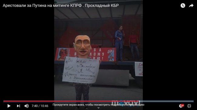 Согласно федеральному законодательству, на митинге нельзя скрывать лицо, так как это мешает установить личность (п. 4.1 ст. 6 ФЗ-54 «О митингах»). Прохладненский районный суд 28 августа оштрафовал Валентину Смирнову по статье о нарушении установленного порядка проведения митинга (ст. 20.2 КоАП) за то, что 13 июля на митинге в поддержку Павла Грудинина, организованном КПРФ, она надела голову Путина и некоторое время держала плакат «Во всем виновен я».